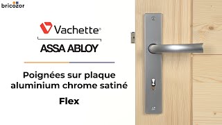 La poignée de porte sur grande plaque flex de la marque VACHETTE est en zamak de couleur aluminium chrome satiné.
