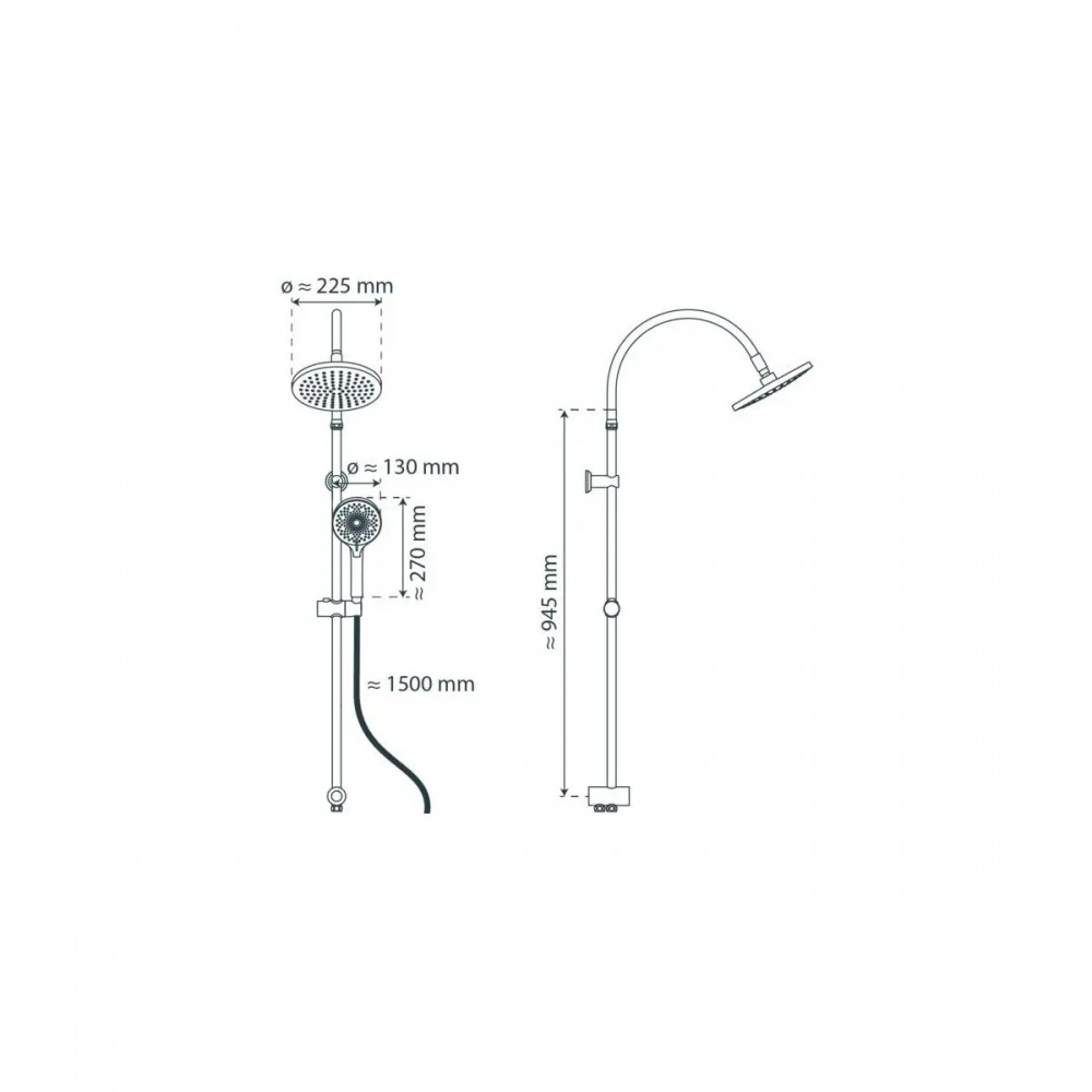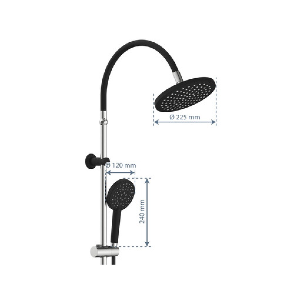 1 Barre de douche en acier inoxydable. 1 Douche de tête Ø 22,5 cm. 1 Douchette à main 3 jets. 2 Flexibles synthétiques noir mat (150 cm et 70 cm). Supports muraux réglables et support de douchette coulissant. Matériel de montage.