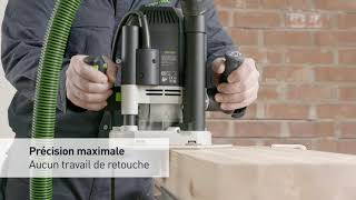 Grâce au couplage de l'unité moteur avec la plaque de base, vous pouvez déplacer la plaque de base vers le haut ou le bas par pas de 1/10 de millimètre pour un réglage fin maitrisé. La fraise à profiler pourra ainsi êre adaptée plus précisément et rapidement à la pièce à travailler. La course de fraisage de cette défonceuse Festool est de 80 millimètres avec une pince dépassant jusqu'à 10 millimètres au-dessus de la plaque de base. Les fraises sont bloquées de manière sûre, y-compris dans les matériaux épais.