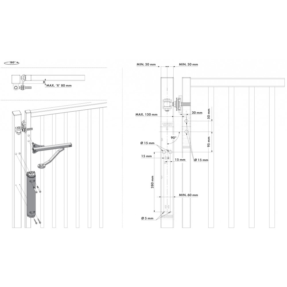 Ce ferme portail convient pour un portail de 120 kg et de 1200 mm de largeur maximum. Il est réversible et se pose par inserts.
