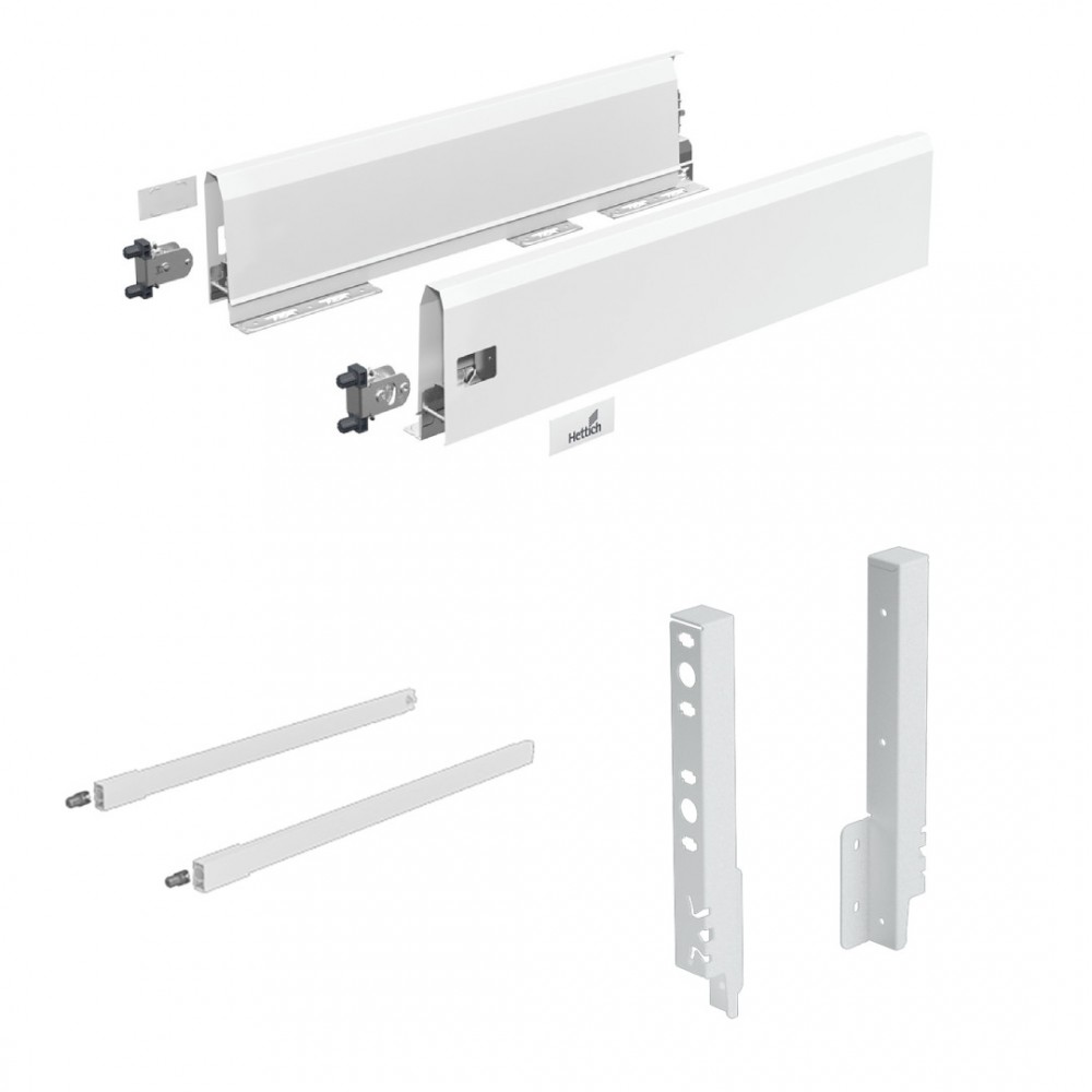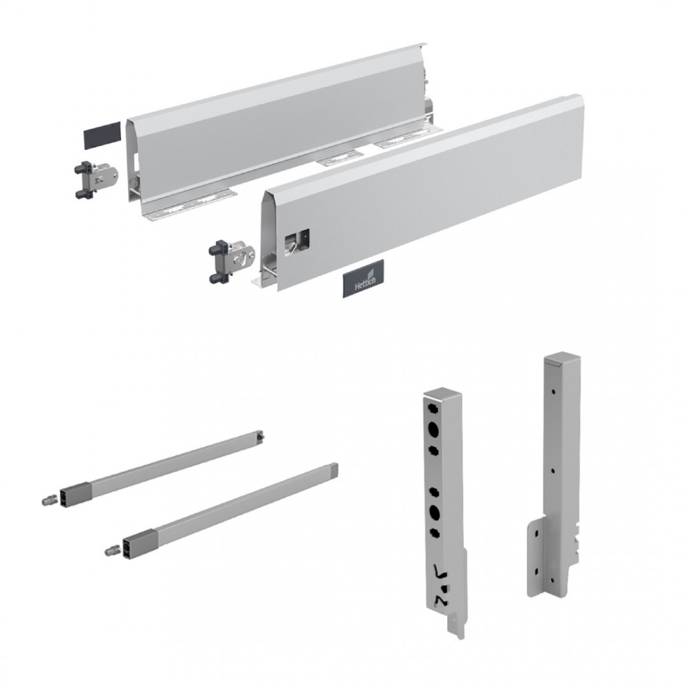 Ce kit tiroir Arcitech HETTICH permet de réaliser un tiroir de hauteur de profil de 126 mm avec un dos de 218 mm. Les tringles latérales permettent de doubler vos hauteurs de rangement avec une grande facilité d'accès. Elles se positionnent au dessus des profils (les profils sont les côtés du tiroir).