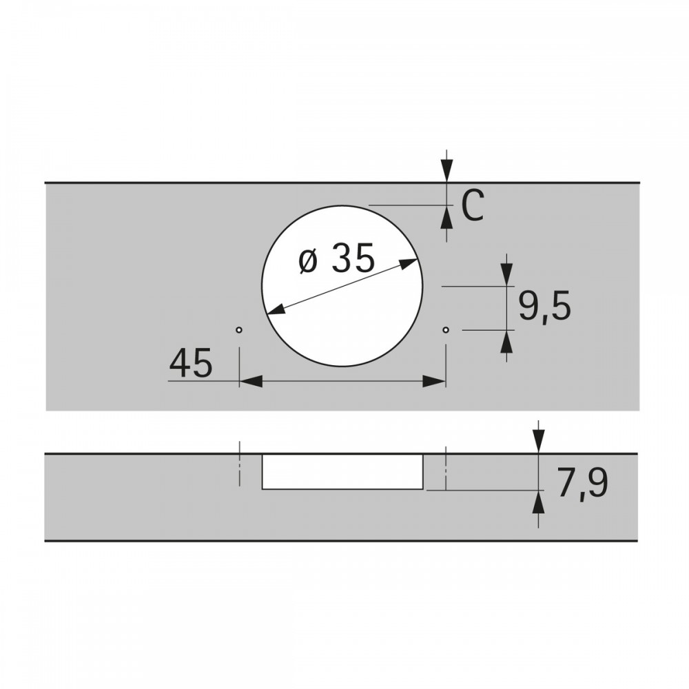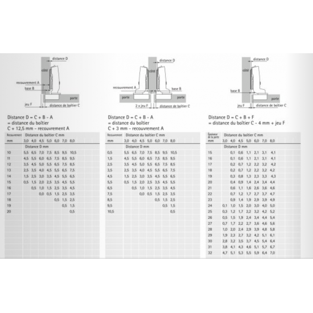 - Ouverture 95° pour portes de 15 à 32 mm et portes moulurées