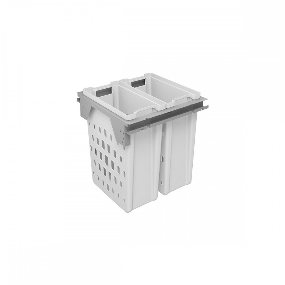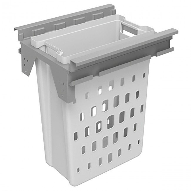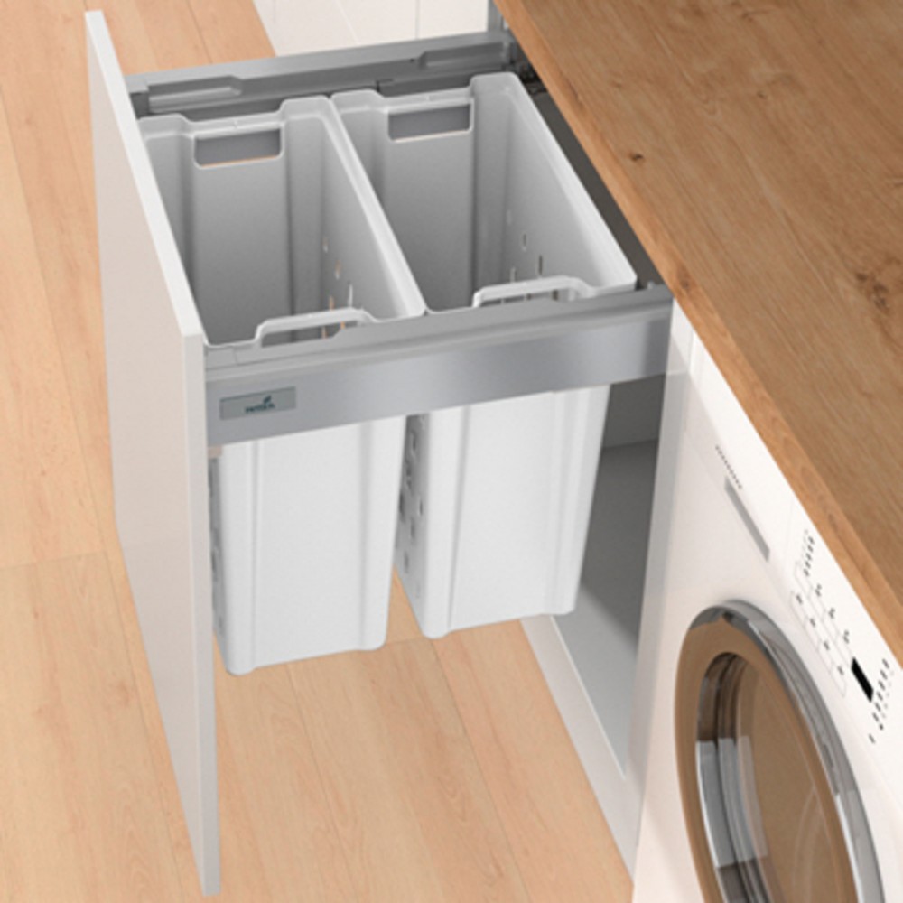 Ce système de cadre et corbeilles à linge coulissants Laundry est spécifiquement conçu pour l'aménagement intérieur des tiroirs des gammes InnoTech et InnoTech Atira, avec une hauteur de profil de 70 mm. Le cadre InnoTech Pull Laundry, de couleur époxy argent, vient remplacer le fond de tiroir standard et s'installe directement sur les coulisses. Les corbeilles à linge, fabriquées en plastique blanc et équipées de poignées, sont amovibles pour faciliter le transport du linge.