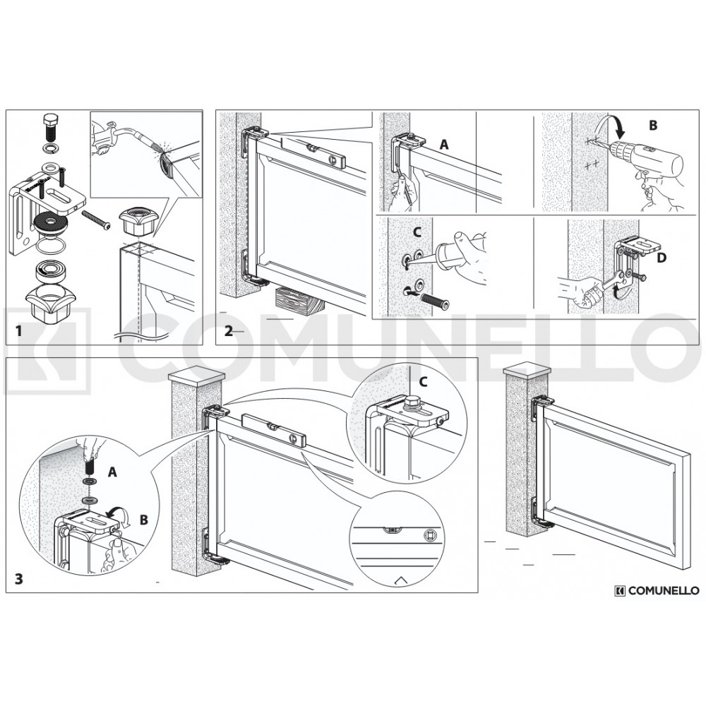 Ce gond supérieur réglable est idéal pour une installation facile et un fonctionnement optimal du portail battant de la marque Comunello.