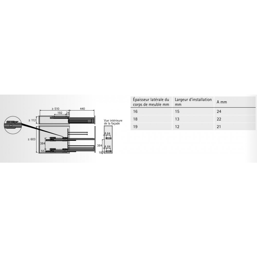 Conçu pour une largeur d'armoire de 150 mm, il nécessite des dimensions intérieures minimales de :