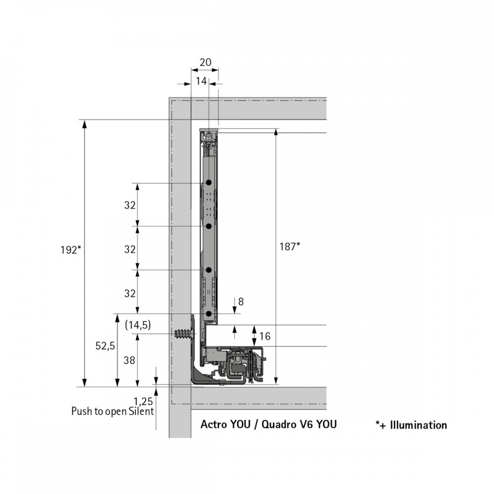 À commander séparément : les coulisses Actro YOU ou Quadro YOU et les attaches façades à visser 573976 ou à enfoncer 573969. Fonds et dos non fournies.