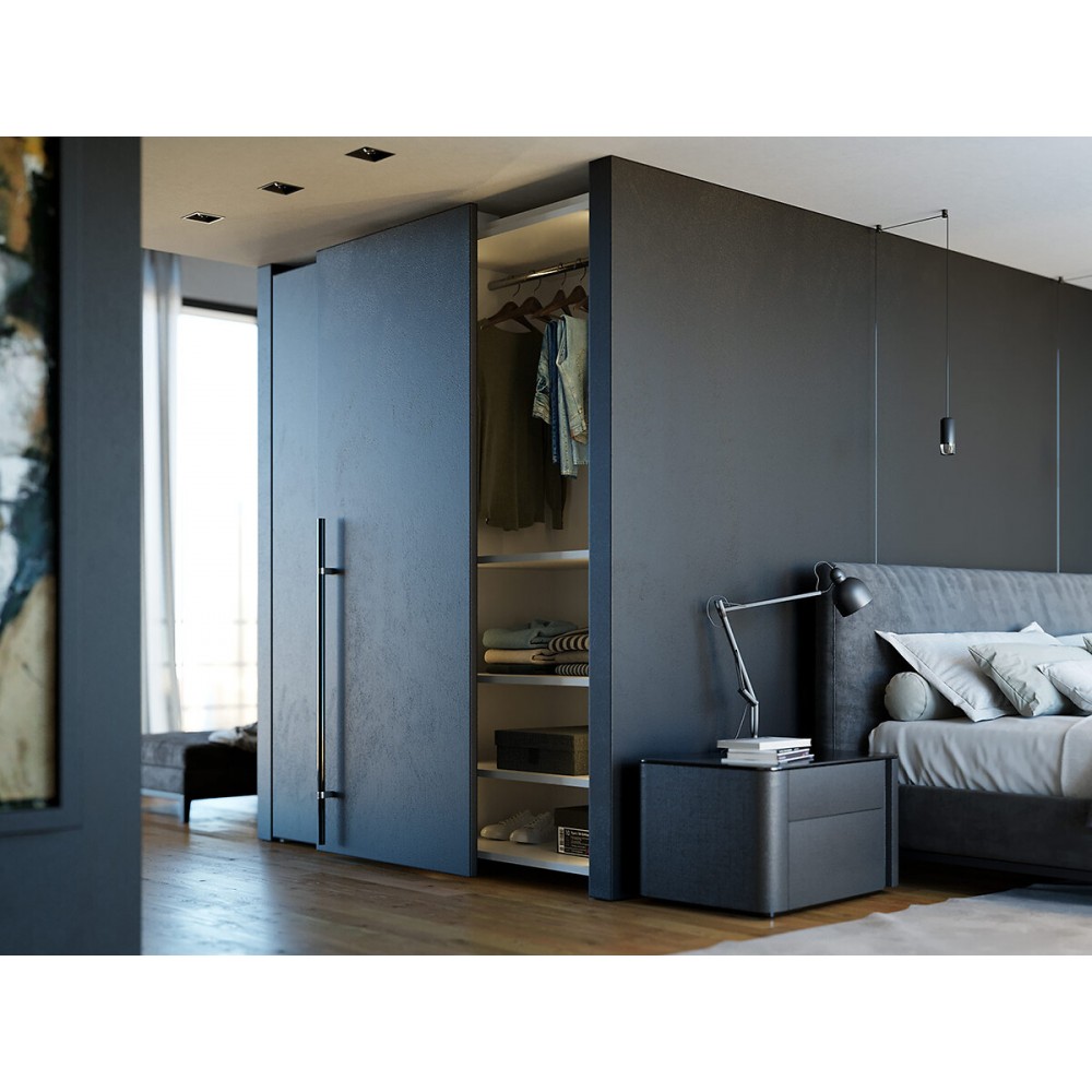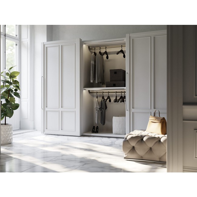 À noter : L'ouverture des portes se fait par des poignées centrées. Pensez à laisser un jeu minimum de 60 mm entre le meuble et le plafond. Ce système est également utilisable avec le cadre aluminium Clipper.