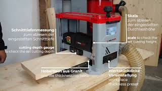 La table de rabotage en tôle d'acier, dotée de tables d'entrée et de sortie, assure un support stable et précis pour vos pièces de bois. Une échelle de réglage de la hauteur de travail clairement lisible et une manivelle permettent un ajustement précis de la hauteur de passage. La mesure de la profondeur de coupe vous offre un contrôle total sur l'épaisseur de matière enlevée, avec une profondeur de passe maximale de 2,8 mm pour les largeurs de rabotage inférieures à 152 mm et de 0,8 mm pour les largeurs supérieures.
