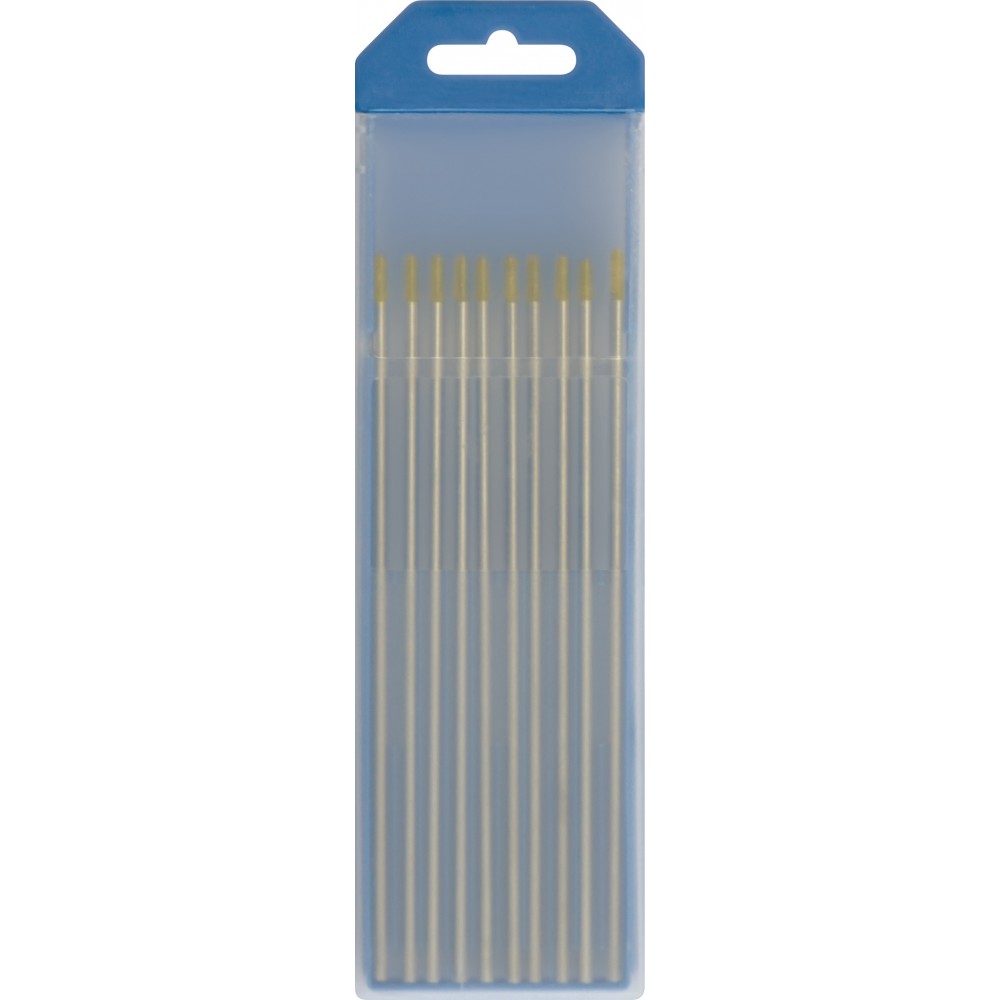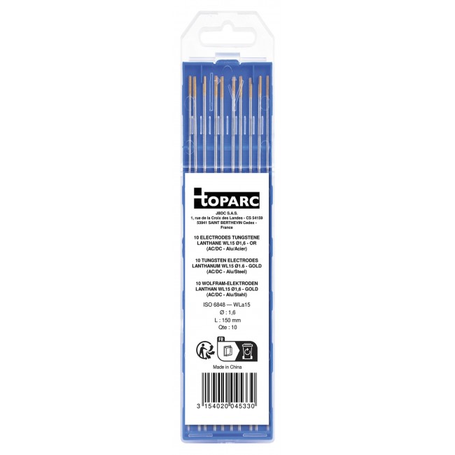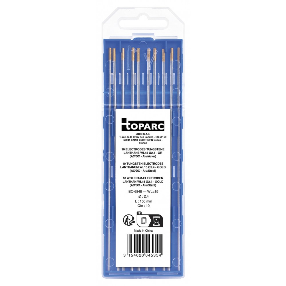 Ces électrodes tungstène WL15 (reconnaissables à leur extrémité de couleur or) sont composées d'un alliage de tungstène enrichi à 1,5 % d'oxyde de lanthane. Cet ajout confère aux électrodes des propriétés de performance supérieures sans être radioactives (contrairement aux électrodes thoriées).