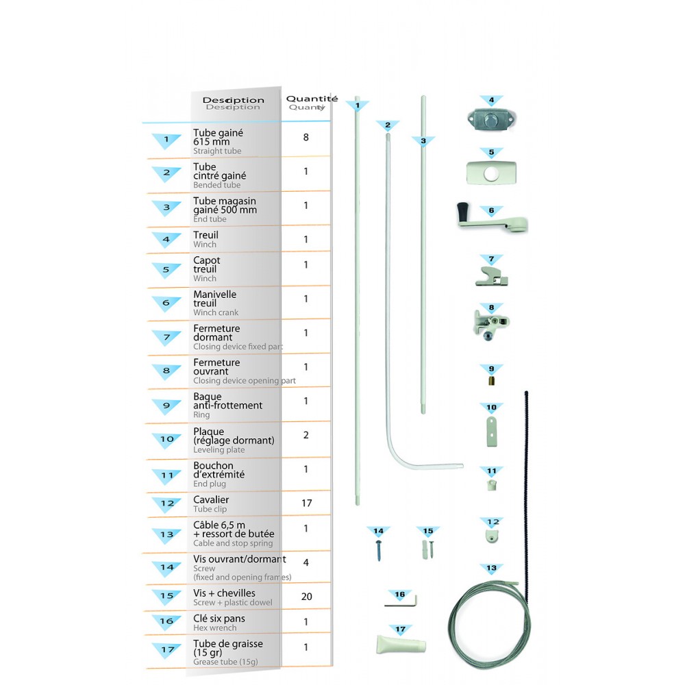 - Kit complet avec câble souple, treuil, tubes gainés, manivelle et accessoires de fixation.
