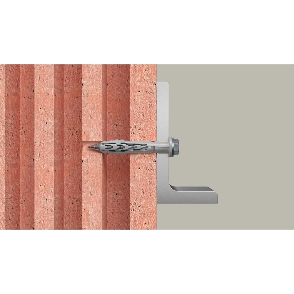 Avec une longueur de 260 mm, cette cheville est idéale pour fixer des éléments sur des murs déjà isolés par l'extérieur (ITE). Veillez à bien dépoussiérer le trou de perçage à l'aide d'une soufflette : avec un ancrage de seulement 50 mm au fond d'un perçage aussi long, la propreté du trou est déterminante pour la tenue finale.
