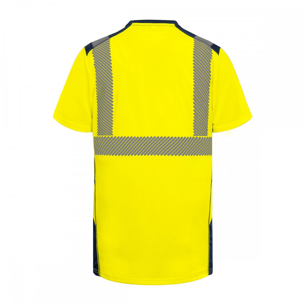 Le T-shirt a un col V avec une bande de propreté, des manches courtes terminées par un bracelet, et un léger couvre-reins. Il est fabriqué pour une durabilité maximale, résistant à 50 cycles de lavage à 60°C sans perdre ses propriétés de haute visibilité.