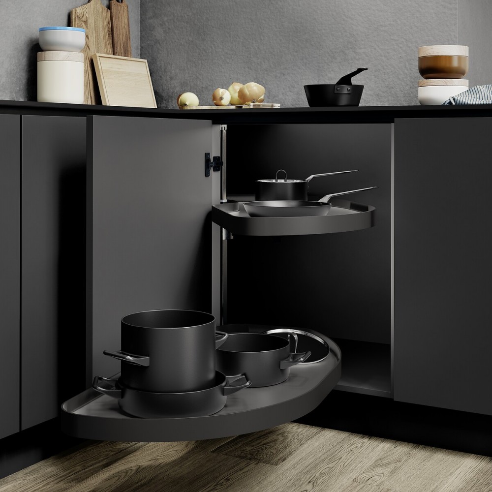 Le Cornerstone® MAXX représente le sommet de l'innovation pour les meubles d'angle de cuisine. Sa cinématique unique à déploiement en ligne droite permet d'extraire les plateaux entièrement sans bloquer l'accès aux meubles mitoyens. Avec sa finition Planero haut de gamme, il allie une esthétique épurée à une robustesse exceptionnelle.