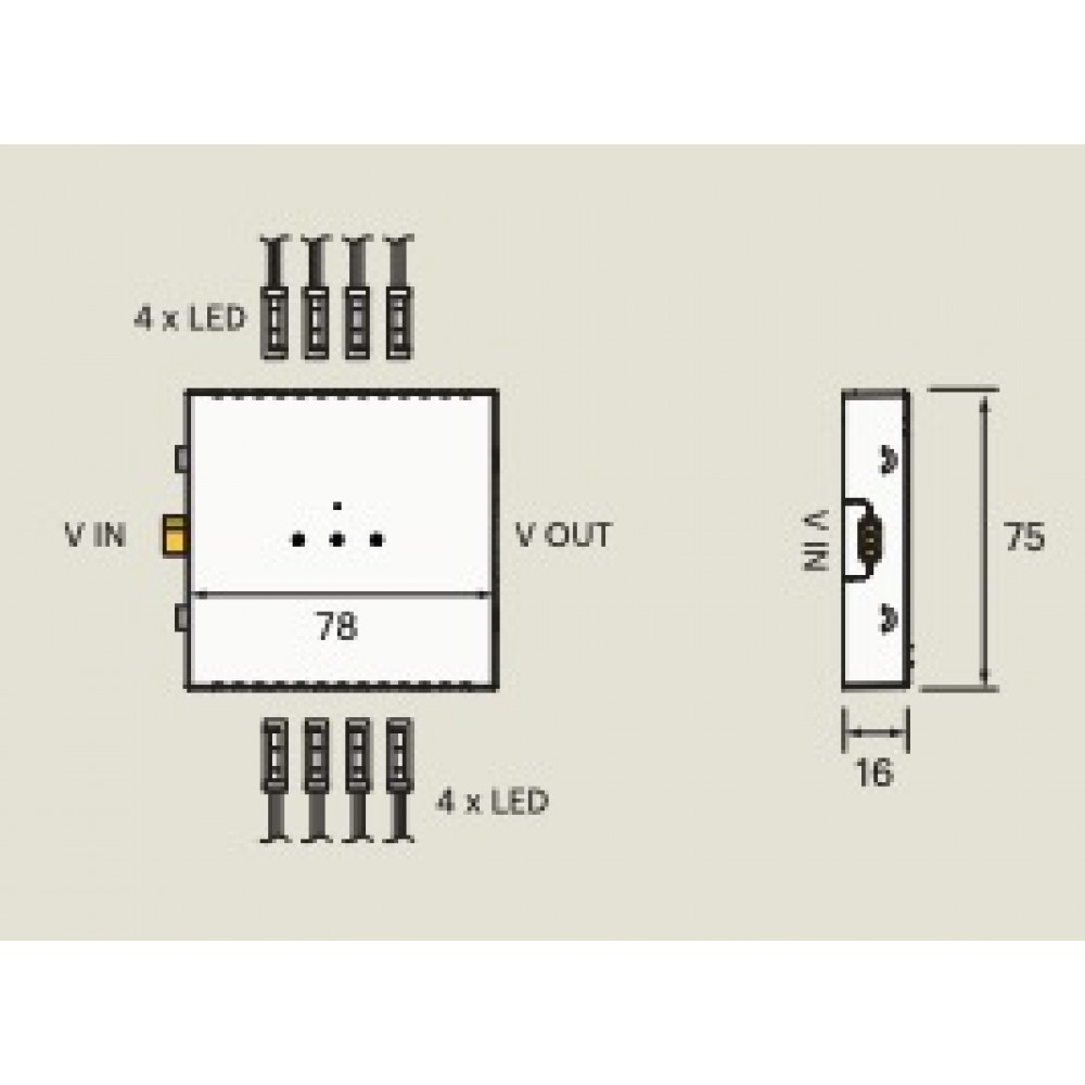 Ce module peut piloter jusqu’à 8 lampes LED simultanément, tout en garantissant une tension de fonctionnement uniforme de 24 V sur l’ensemble des modules connectés en ligne continue.