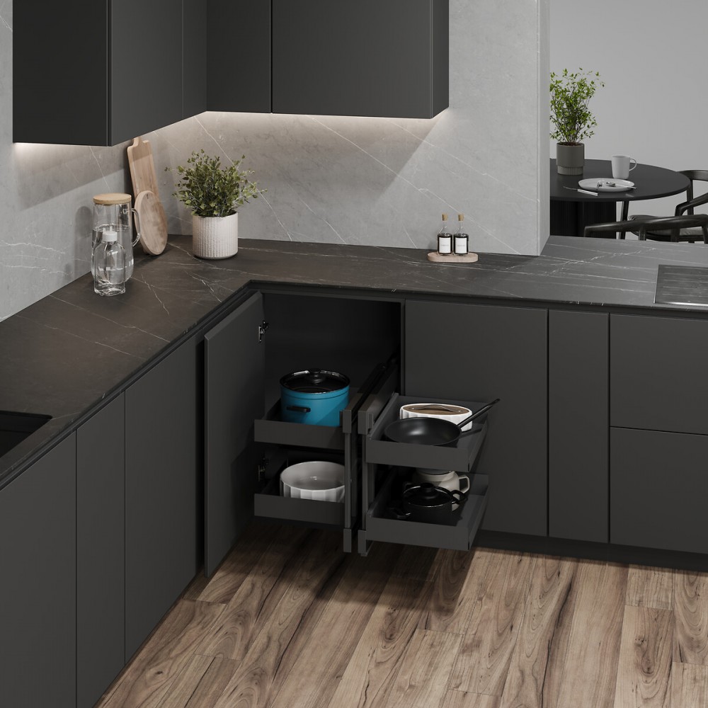 Le système Tal Cor Flex est la solution idéale pour transformer les angles morts de votre cuisine en espaces de rangement dynamiques et totalement accessibles. Grâce à son mouvement fluide, il extrait les paniers du fond du meuble pour les amener directement à portée de main.