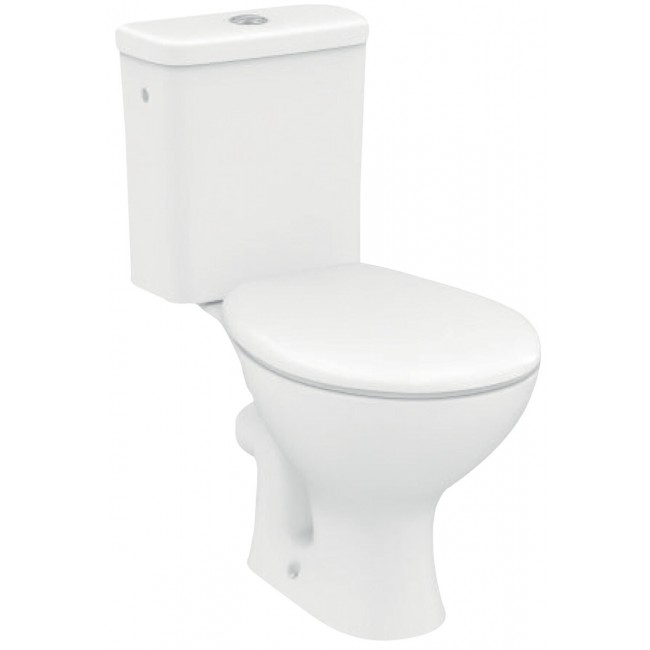 Ce modèle complet comprend une cuvette sur pied à sortie horizontale, un réservoir double touche NF 3/6 L et un abattant blanc avec charnières en plastique.