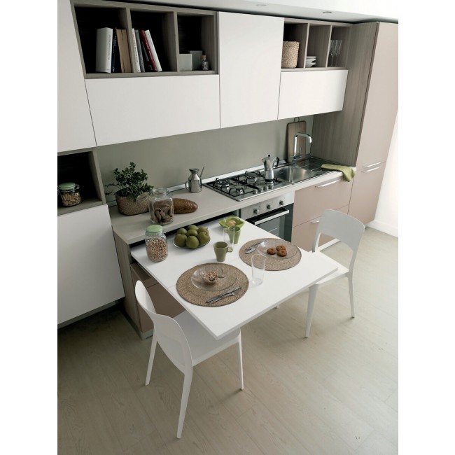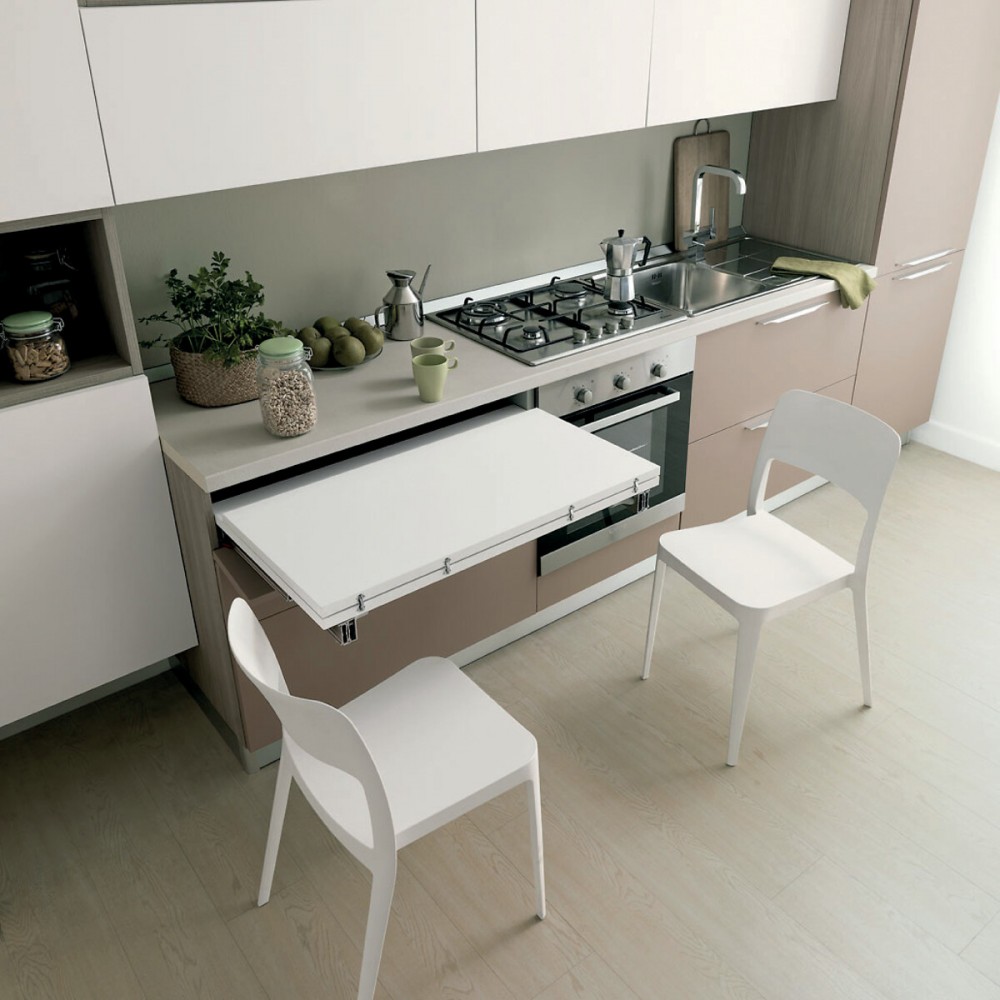 Le système Lunch est un mécanisme innovant permettant de déployer une table d'appoint à partir d'un simple tiroir de cuisine. Sans pied de soutien, cette solution optimise les espaces restreints comme les kitchenettes en créant un plan de travail ou un espace de repas supplémentaire en un geste.