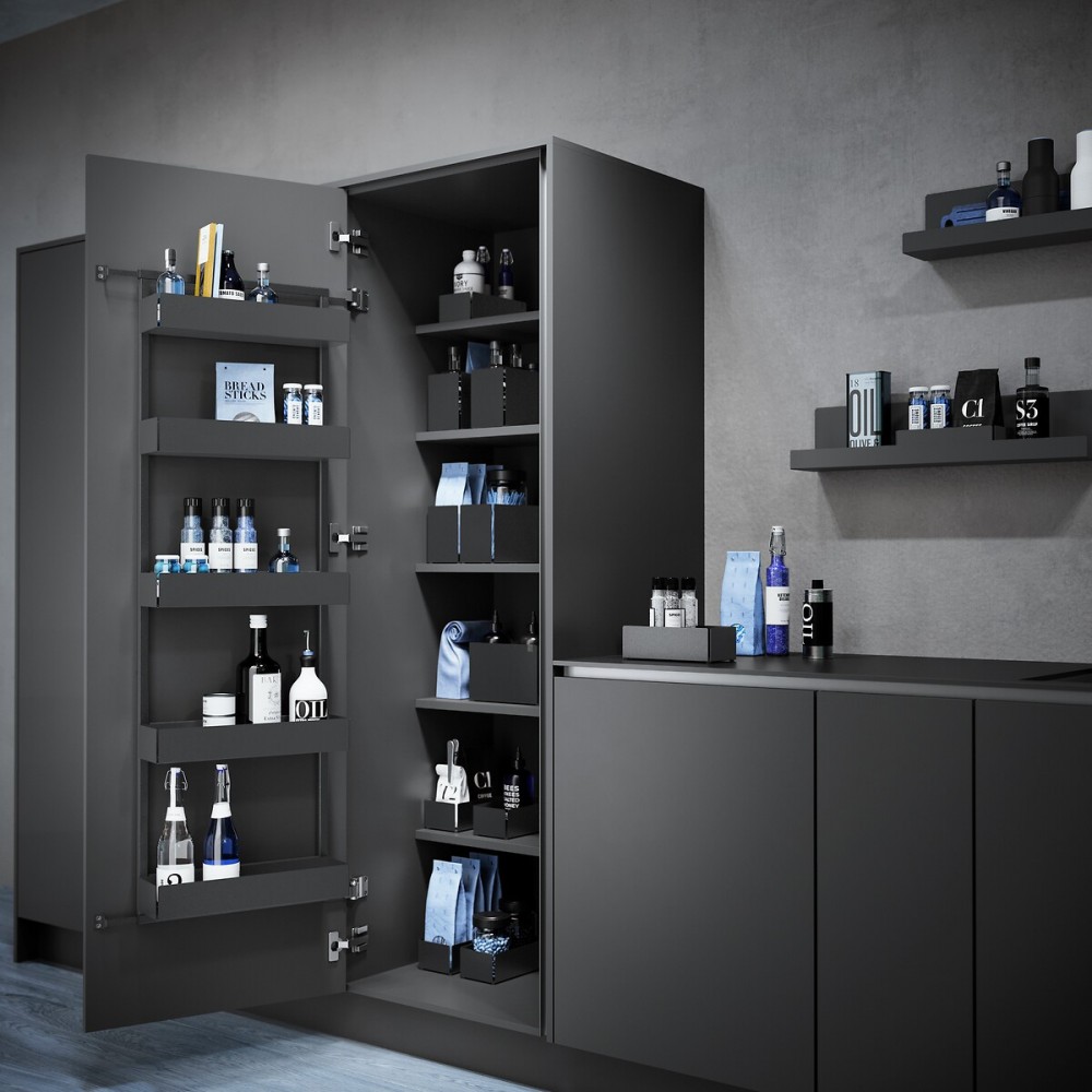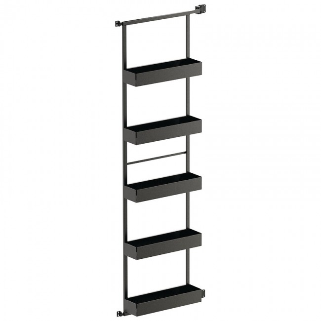 Ce système est une "astuce" idéale pour les cuisines compactes : avec seulement 143 mm d'épaisseur, il permet de créer un véritable garde-manger sur la face interne d'une colonne de cuisine sans empiéter massivement sur l'espace intérieur. Si vous choisissez une fixation murale ou sur joue, n'hésitez pas à l'utiliser pour des objets plus lourds (bouteilles, bocaux), car sa capacité de charge est alors quadruplée (20 kg par niveau).