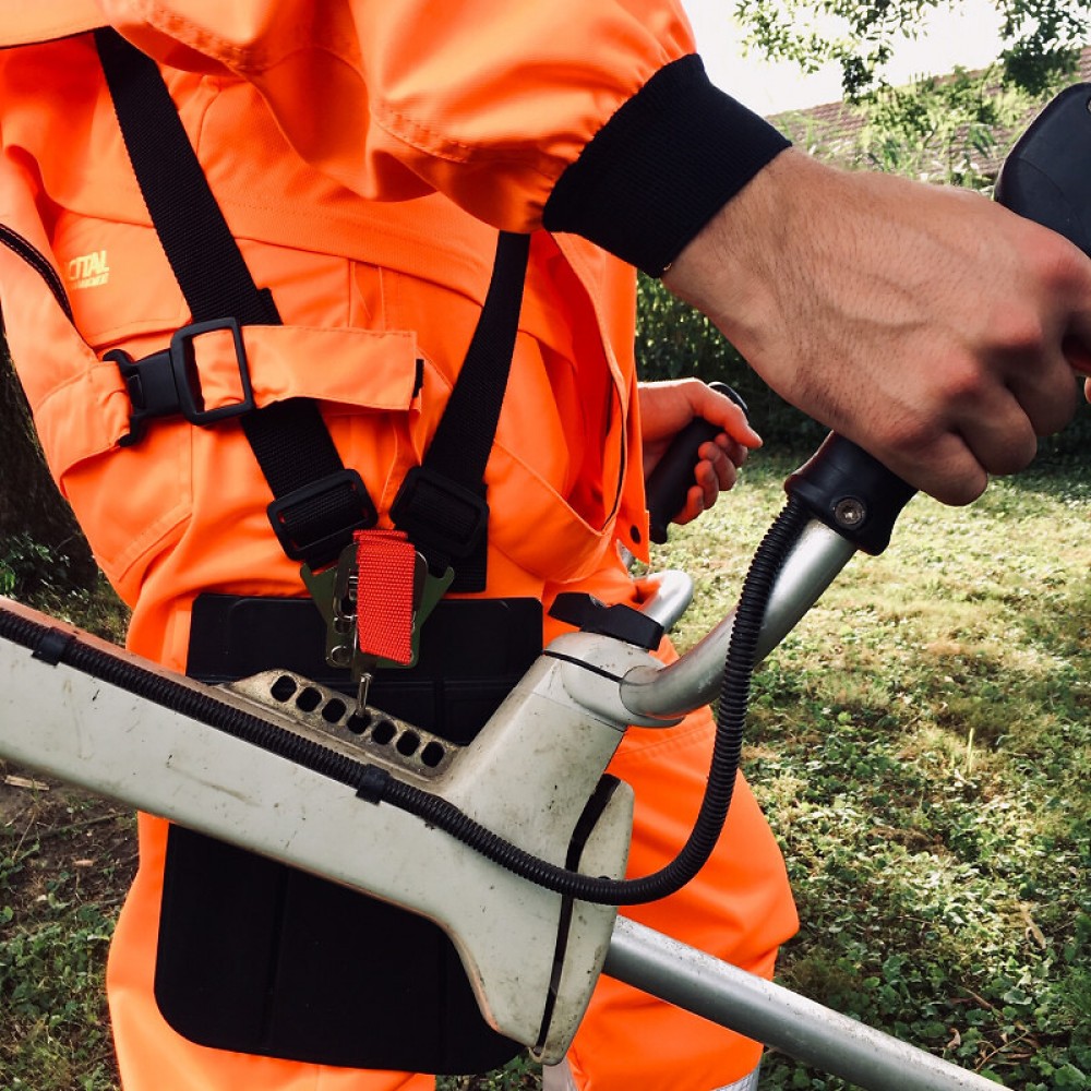 Elle est conçue spécifiquement pour le débroussaillage, avec une découpe elliptique sur le côté droit facilitant le passage du harnais de la débroussailleuse.