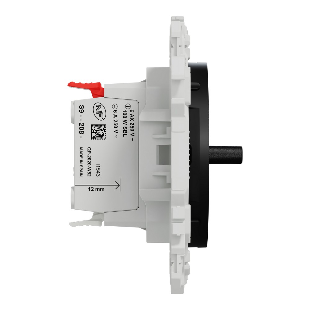 La fixation est à la fois simple et robuste, adaptée à tout type de boîtes d’encastrement grâce à un support rigide à vis. Des griffes clipsables (non fournies) peuvent être ajoutées pour faciliter la pose en rénovation. Le mécanisme bénéficie également de bornes automatiques, permettant un raccordement rapide, sûr et fiable des câbles jusqu’à 2x1,5 mm², qu’ils soient rigides, souples ou multibrins, réduisant fortement les risques d’erreur et le temps de montage.