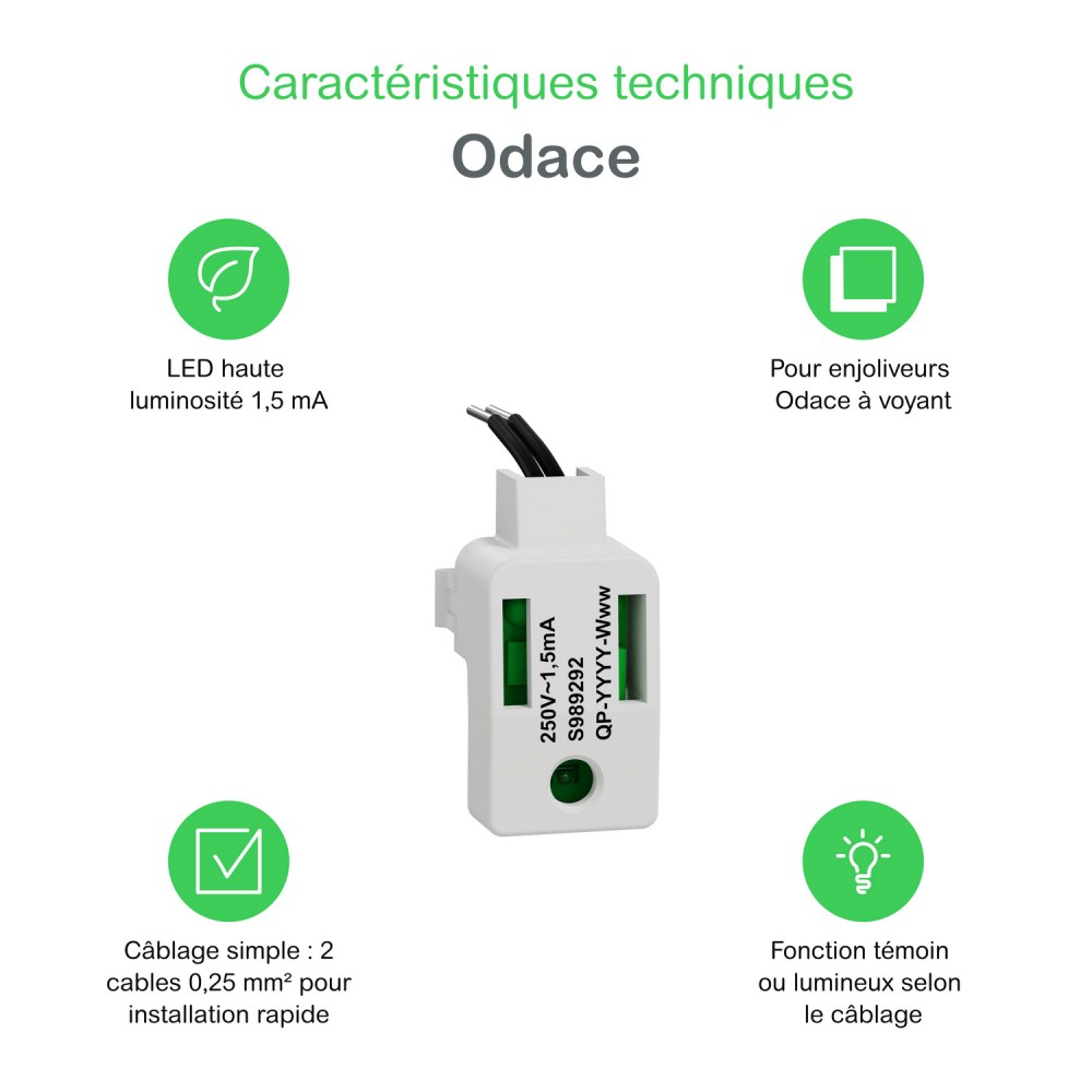 Conçue pour une intégration simple et rapide, elle transforme vos interrupteurs ou poussoirs Odace en points lumineux ou témoins, améliorant la visibilité et la sécurité de votre installation électrique.