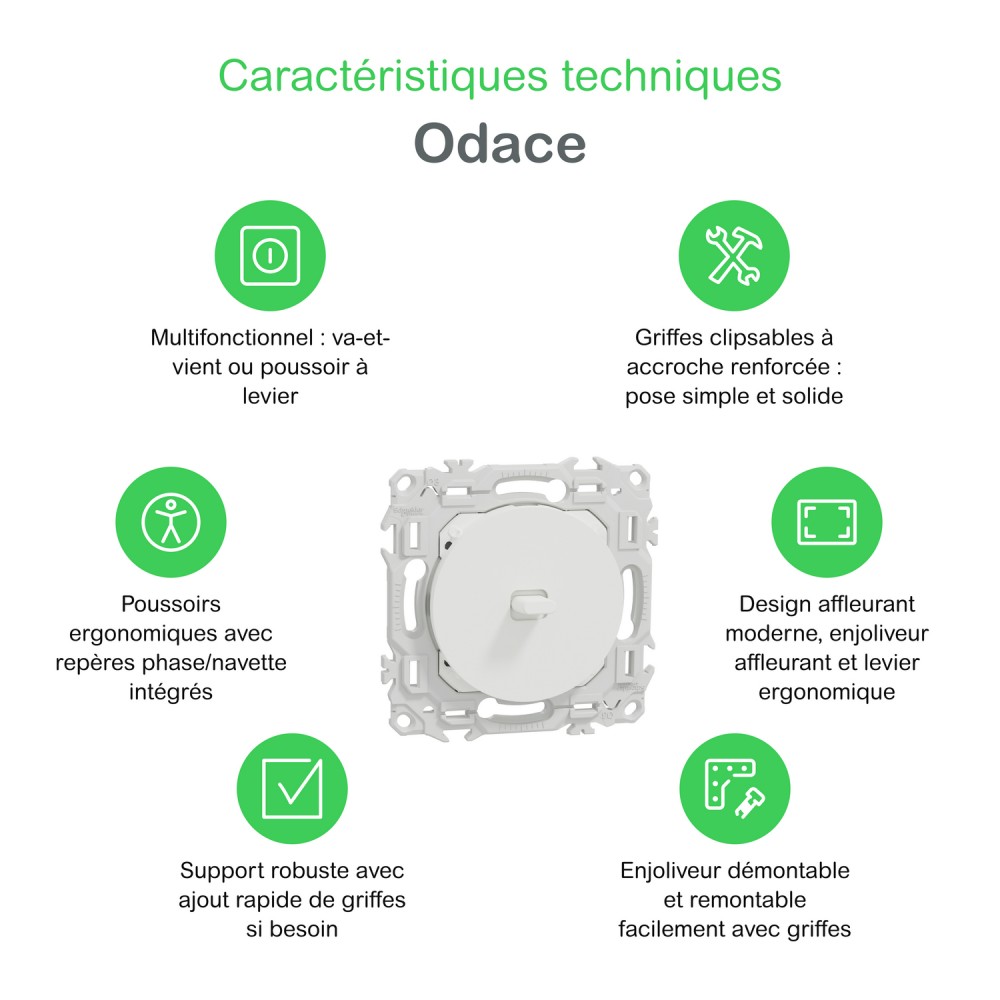 Ce mécanisme va-et-vient ou poussoir 10AX Odace 2025 combine un design moderne et élégant, parfaitement affleurant, renforcé par son enjoliveur affleurant et son levier ergonomique qui apporte une touche rétro ou classique selon l’ambiance souhaitée.