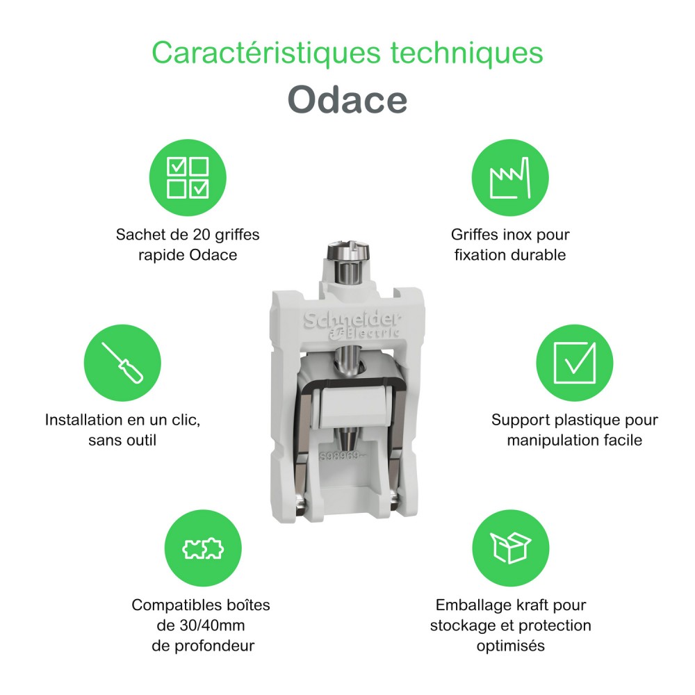 Ce lot de 20 griffes courtes Odace est spécialement conçu pour une fixation rapide et fiable des mécanismes Odace nouvelle génération (2025) dans les boîtes d’encastrement de 30 mm et 40 mm de profondeur.