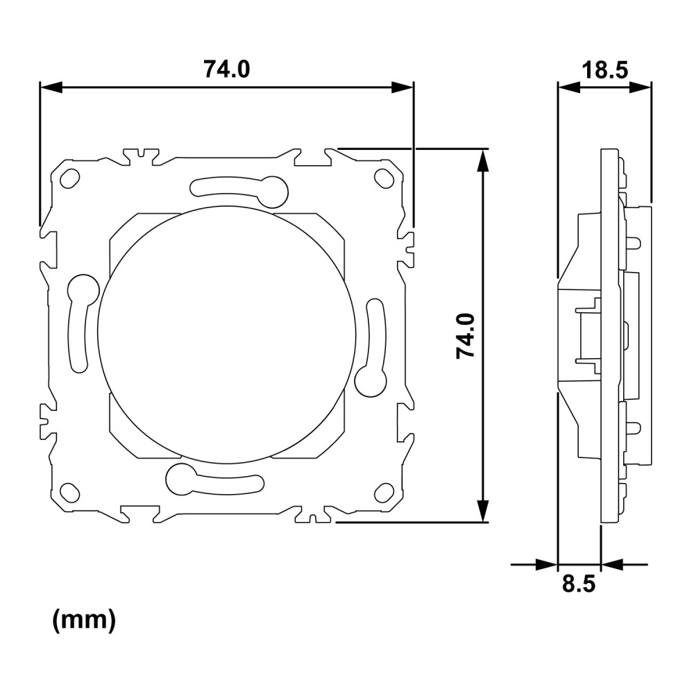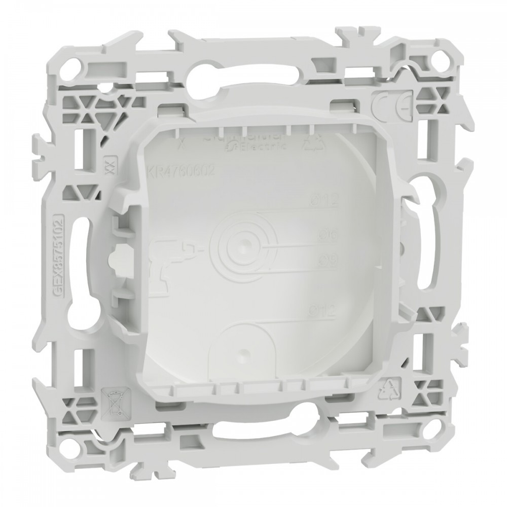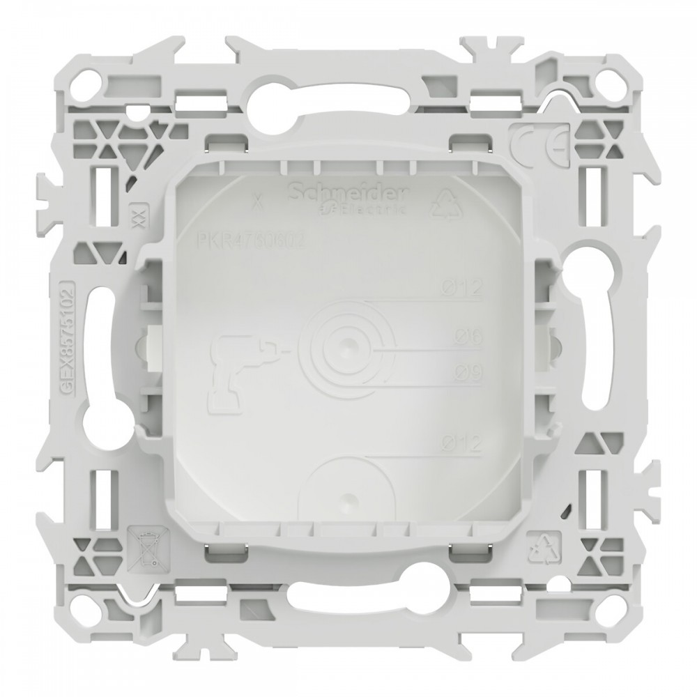 La fixation est simple, robuste et sécurisée, grâce à un support rigide adaptable à tout type de boîte d'encastrement. Des griffes clipsables peuvent être ajoutées en option, particulièrement pratiques en rénovation, pour garantir une installation stable.
