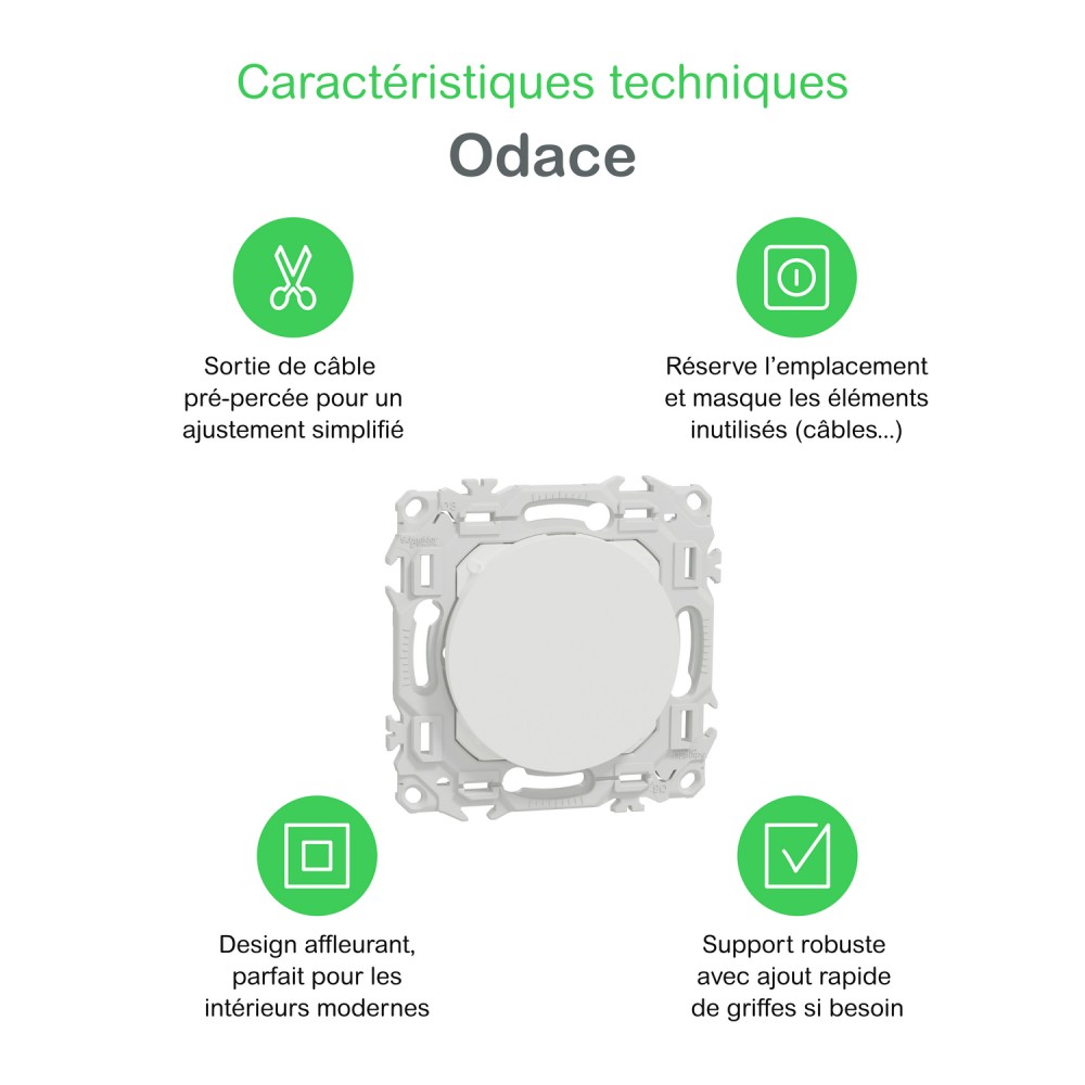 L’obturateur est livré avec son support de fixation intégré ainsi qu’un cache peinture, ce qui simplifie sa mise en œuvre et garantit un rendu impeccable. Il est compatible avec toutes les plaques de finition Odace, qu’il s’agisse des gammes Odace*, Odace Métal, Odace Architecte ou Odace Origine, pour une parfaite harmonie visuelle dans tous les environnements.