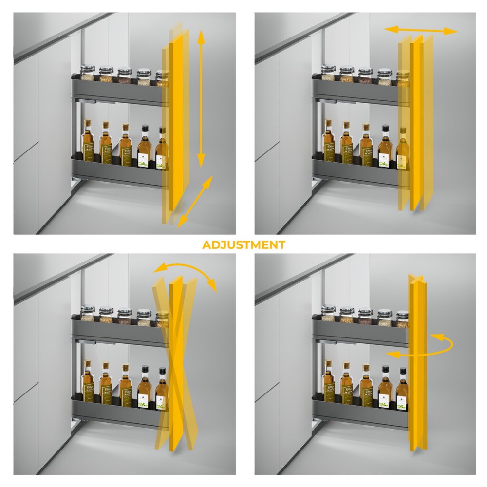Le système utilise des coulisses invisibles à sortie totale et intègre un amortisseur de fermeture, garantissant un accès facile et silencieux à l'ensemble des produits. La structure en acier avec finition gris anthracite et les paniers avec fond en mélaminé effet bois offrent une grande durabilité, une résistance accrue et sont faciles à nettoyer.