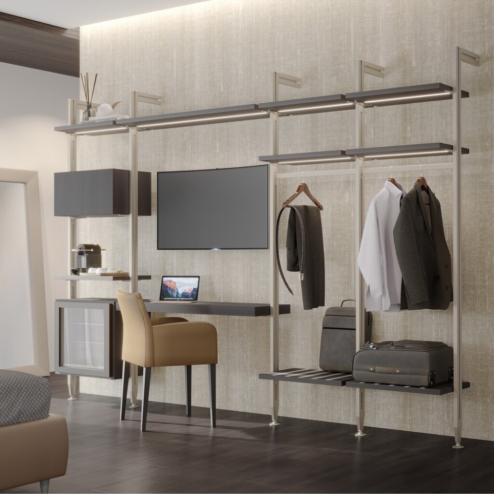 Son design convient à tous les types d'environnements : maison, dressing, bureau et magasins. Il est possible de combiner les accessoires avec les profilés pour créer une composition idéale et personnalisée : étagères en bois ou en verre, modules ou petites armoires et barres de suspension.