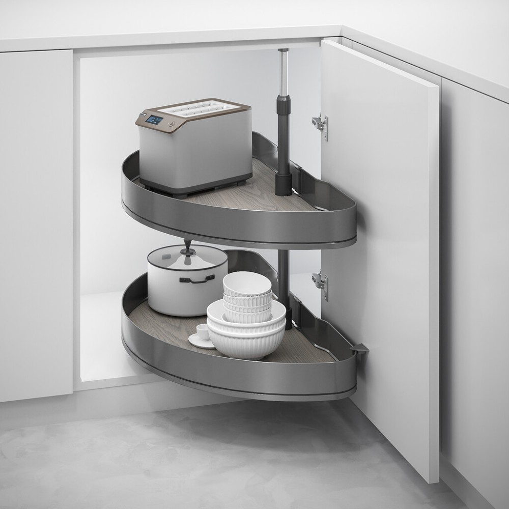 Cet ensemble de plateaux tournants Harmony est une solution d'aménagement conçue spécifiquement pour optimiser l'espace et l'accès dans les meubles d'angle de cuisine. Les plateaux, de forme demi-lune, pivotent en douceur pour un accès aisé aux ustensiles, aliments ou petits appareils électroménagers.