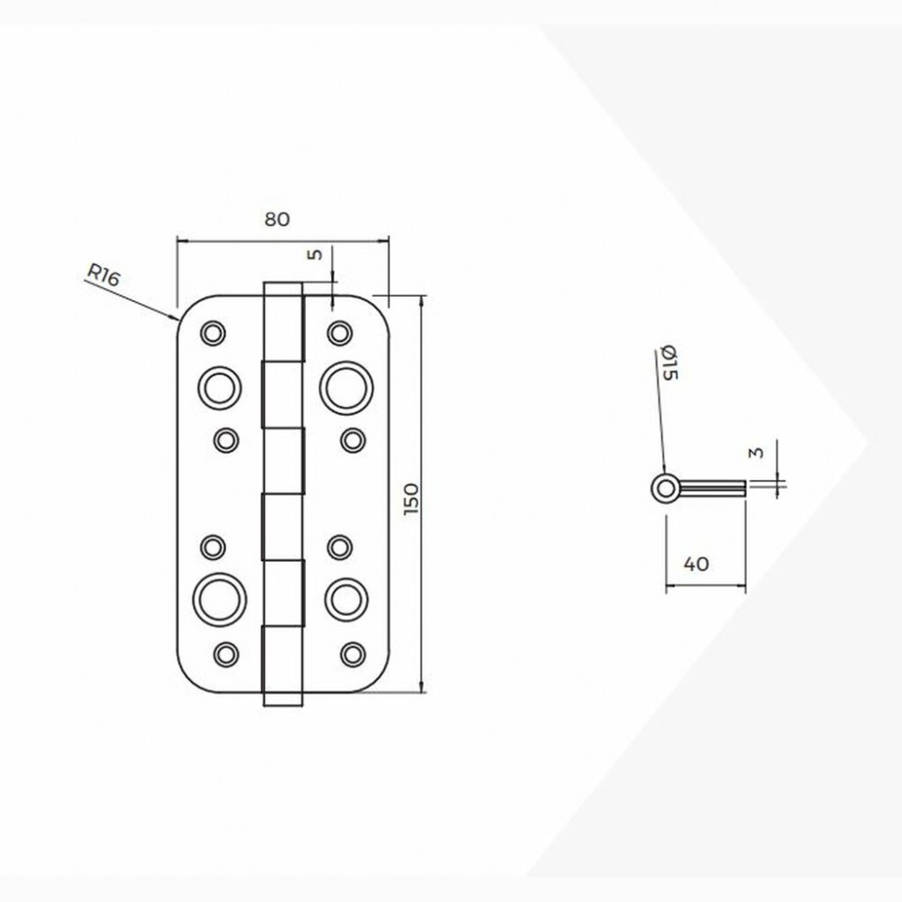 Les paumelles mesurent 150 mm×80 mm et sont fabriquées en acier avec une finition nickel satiné ou noir. Elles présentent un système universel à 2 lames, des bords arrondis et sont sans garnitures.