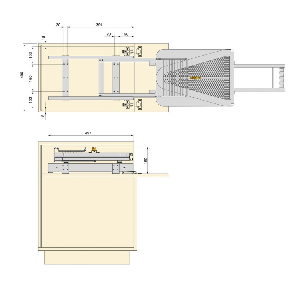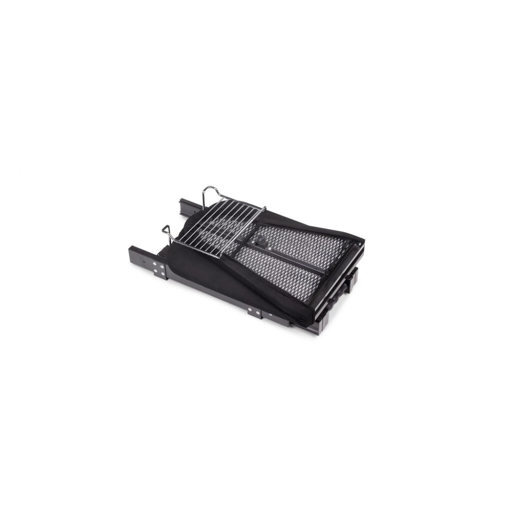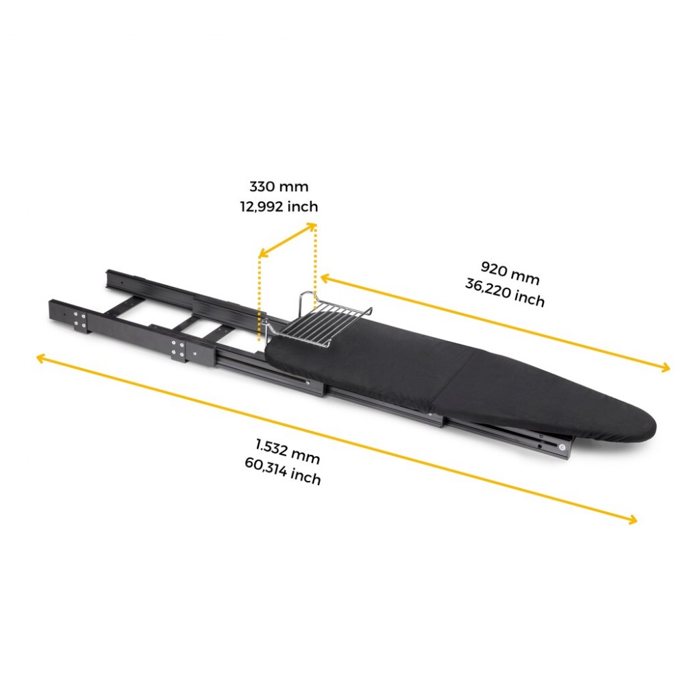 L'extraction du meuble se fait grâce à un système de patins doux de profils télescopiques pour un coulissement en douceur. Elle est dotée d'une poignée pour faciliter l'extraction et d'un système de clipsage pour maintenir la planche solidement en position dépliée. Elle comprend également un support en acier pour y déposer le fer à repasser.
