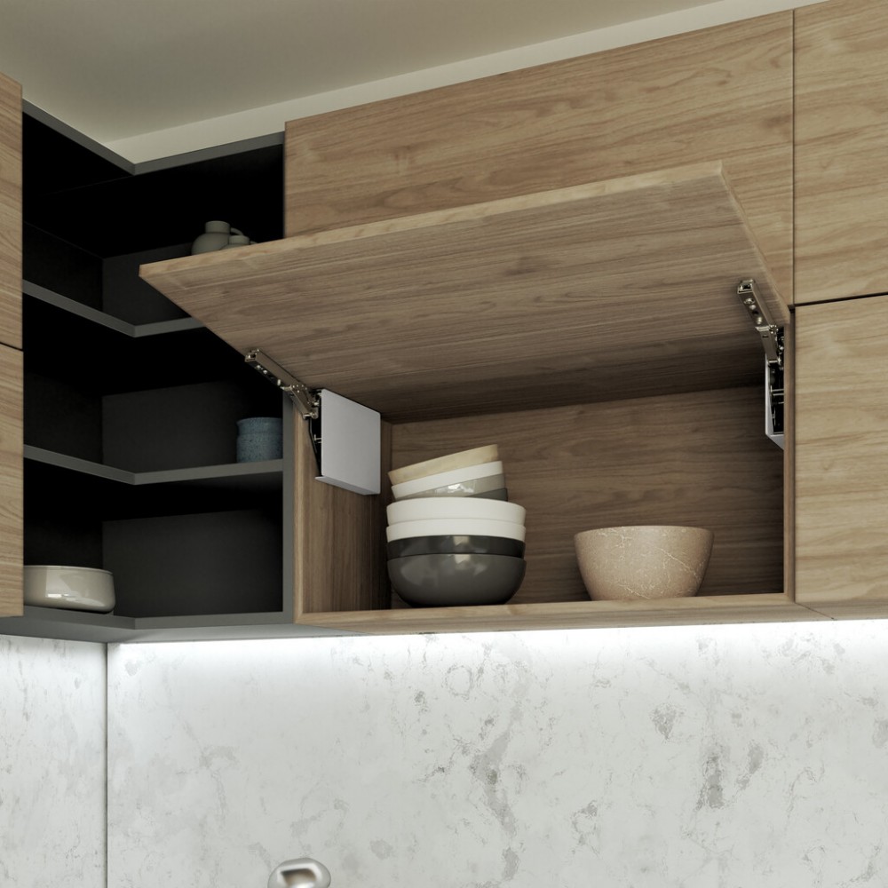 Le système de compas Altius Lift est une solution avancée et ergonomique conçue pour les portes relevables sans charnières de meubles de cuisine et d'intérieur. Le système assure un mouvement fluide et contrôlé avec une fermeture amortie (souple).