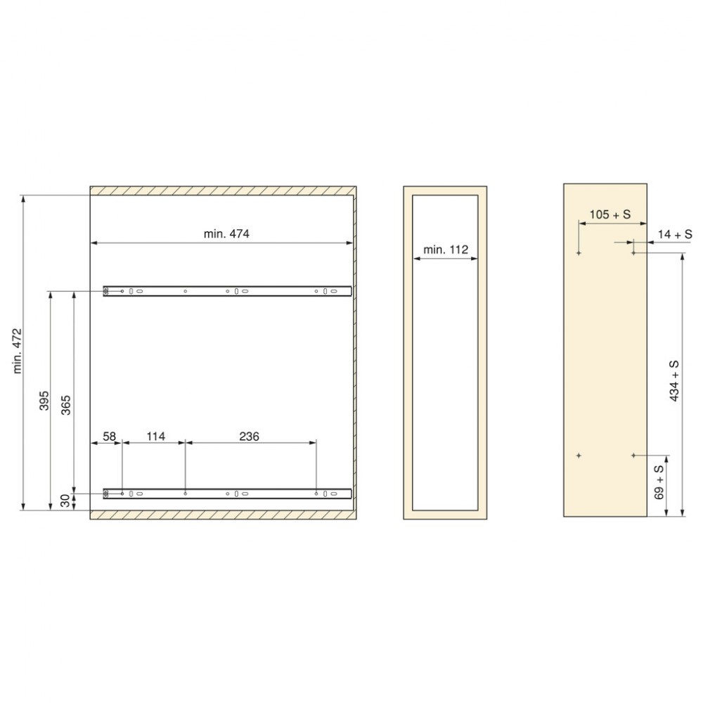 Conçu pour des meubles d'une largeur intérieure minimale de 112 mm et une profondeur minimale de 474 mm. Le modèle est adapté aux modules de 150 mm.