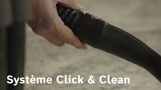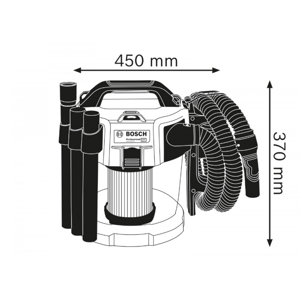 L'appareil est livré avec un tuyau d’aspiration de largeur nominale 35 mm et une gamme complète d'accessoires (bandoulière, suceur pour sols, suceur droit, tubes, adaptateur pour outil électroportatif, etc.). Il est compatible avec le système d’aspiration de poussières Click & Clean de BOSCH.