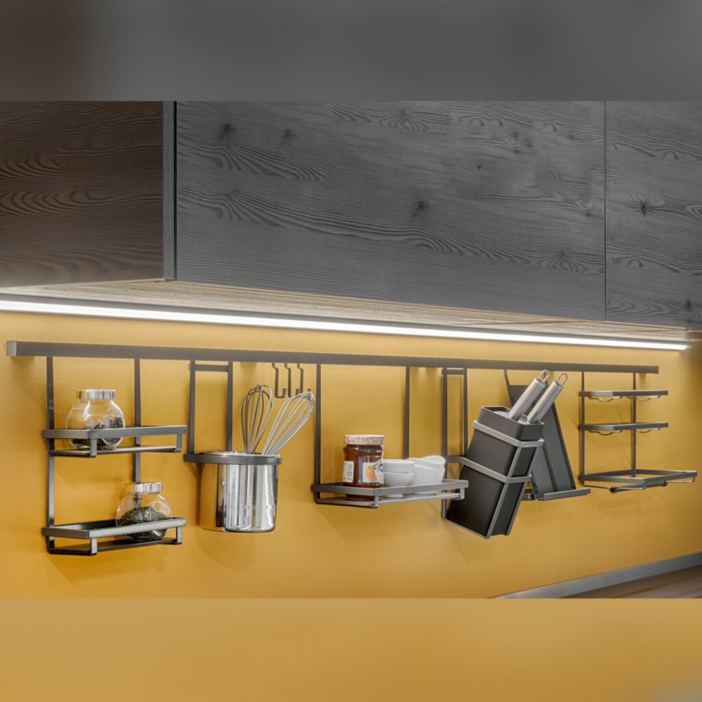 Ce porte-ustensiles Titane est une étagère de rangement au design minimaliste conçue pour être accrochée à un profilé en aluminium fixé au mur, optimisant l'espace de travail dans la cuisine. Il fait partie d'une gamme d'accessoires à suspendre qui permet de garder tous les ustensiles à portée de main, libérant ainsi le plan de travail.