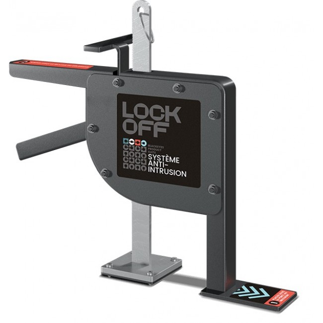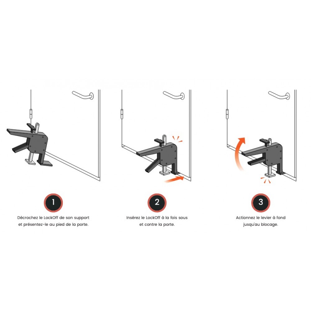 Le LockOff® est un dispositif de verrouillage mécanique breveté, conçu pour bloquer instantanément une porte tirante et créer une zone de confinement sécurisée. Fabriqué en France, ce système en inox permet de réagir face à des situations de crise extrême (attaques, intrusions ou conflits) en bunkérisant une pièce en quelques secondes. Il supporte une poussée d'environ 7 tonnes.