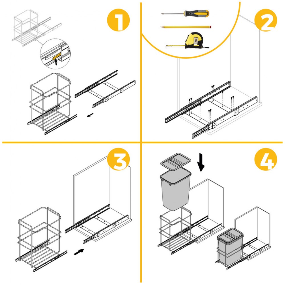 Elle s’installe rapidement par vissage au fond du module, à l’aide des vis fournies. Ce modèle est compatible avec les meubles de cuisine ayant des dimensions minimales de 264 mm de largeur, 460 mm de profondeur et 528 mm de hauteur.