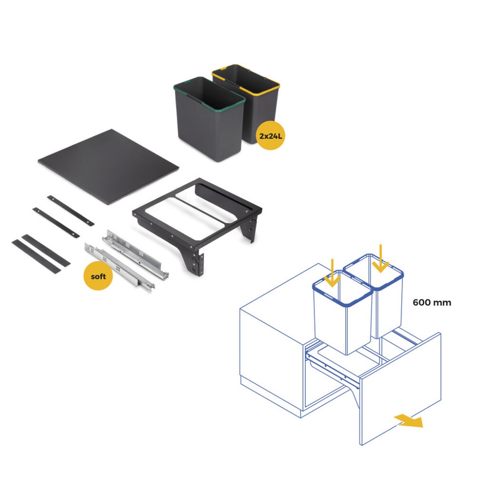 Poubelle de tri sélectif Recycle pour cuisine -2 x 24L -gris anthracite EMUCA