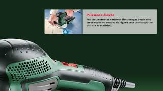 Le système Bosch Electronic inclut une fonction de présélection de la vitesse via un variateur électronique, permettant une adaptation parfaite de la vitesse en fonction du matériau et de l'application. Cette fonctionnalité est essentielle pour le ponçage de surfaces délicates ou le polissage.