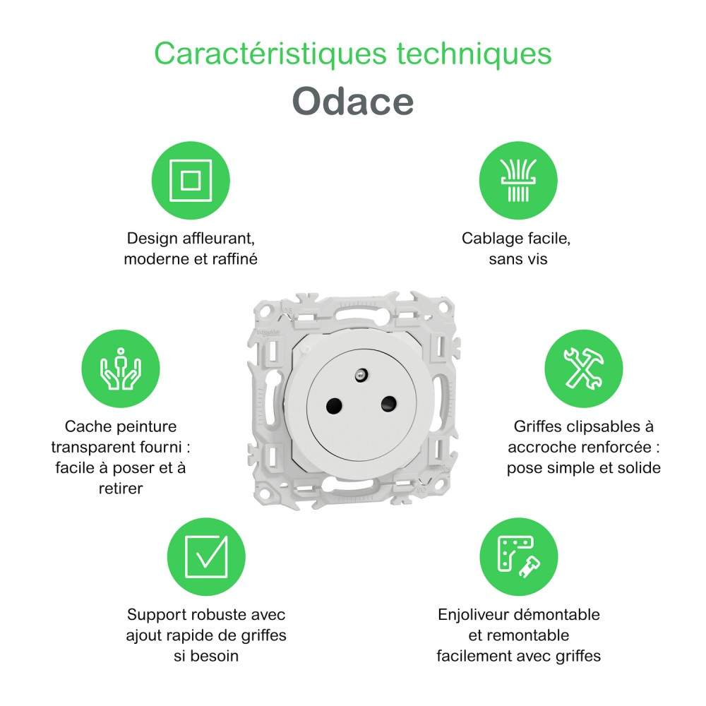 Compatible avec toutes les boîtes d’encastrement courantes, la prise peut être installée aussi bien en construction neuve qu’en rénovation. Elle est conçue pour être associée aux plaques de finition Odace, Odace Métal, Odace Architecte ou Odace Origine afin de s’adapter à tous les styles d’intérieur.