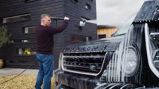 Le système est prêt à utiliser dès le déballage et bénéficie d'une poignée télescopique et d'une poignée rabattable pour un transport et un rangement compacts (dimensions : 321 x 370 x 731 mm). Le système Auto-stop intégré coupe automatiquement le moteur lorsque la gâchette est relâchée, économisant l'eau et l'énergie.