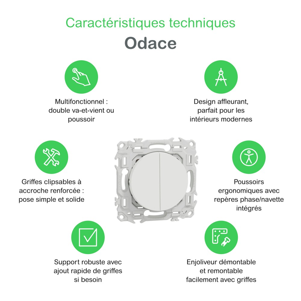 La commande Odace II est livrée avec un support de fixation robuste, un cache peinture, et peut s’associer à toutes les plaques de finition Odace* : Odace Métal, Architecte, Origine, ou la gamme standard. Des griffes clipsables renforcées (non fournies) permettent une installation facile et solide en rénovation, avec un démontage simple de l’enjoliveur si nécessaire.