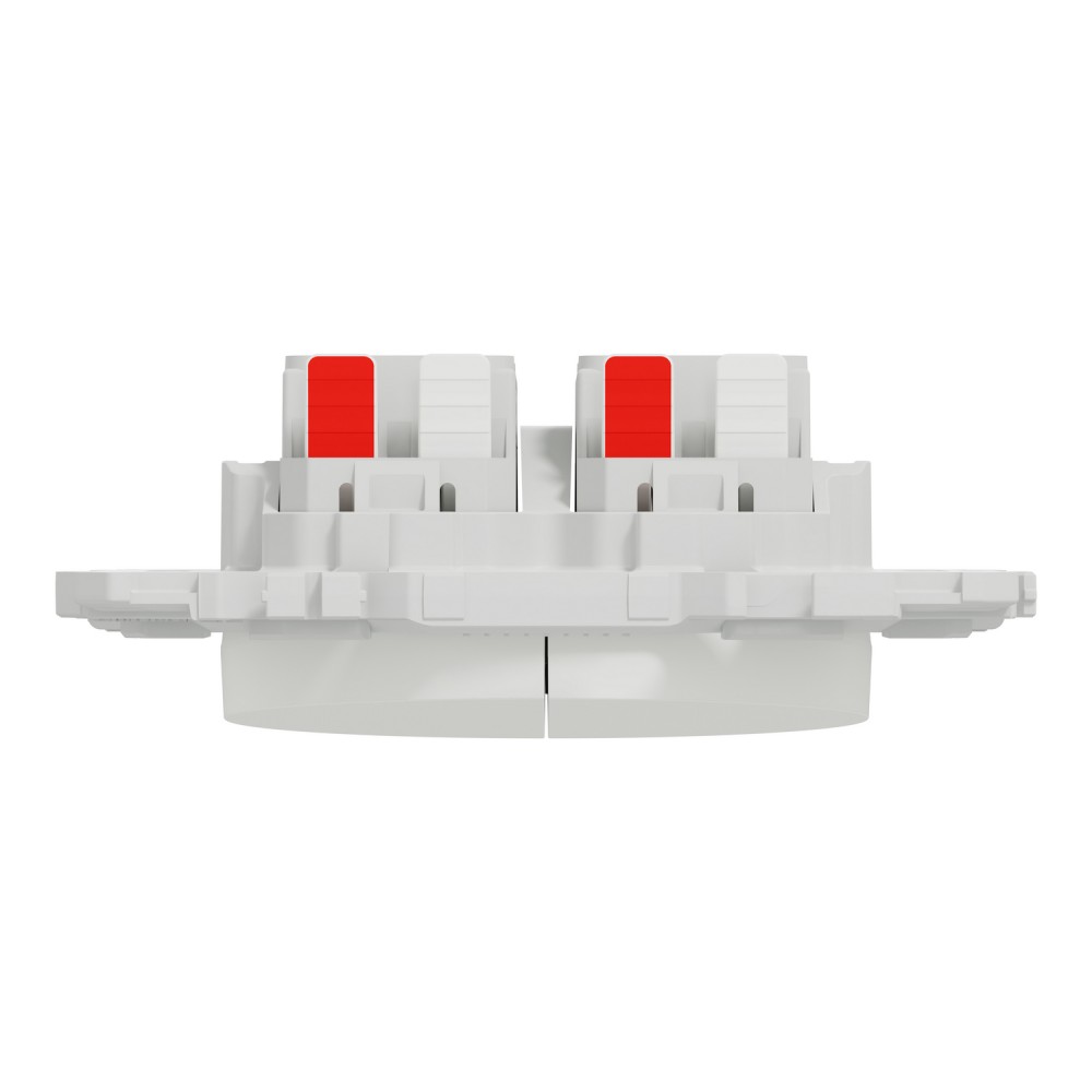 Pour une installation rapide et fiable, le mécanisme dispose de 2 × 3 bornes automatiques acceptant jusqu’à deux câbles de 1,5 mm² (rigides, souples ou multibrins) par pôle. Les poussoirs de déconnexion ergonomiques, marqués en rouge (phase) et en gris (navettes), facilitent l’identification et sécurisent le câblage.