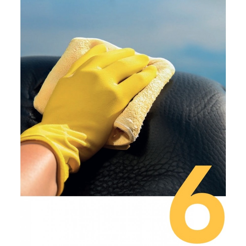- Frotter délicatement à l'aide d'une microfibre ou d'une brosse souple pour faire pénétrer le produit sans endommager le support.