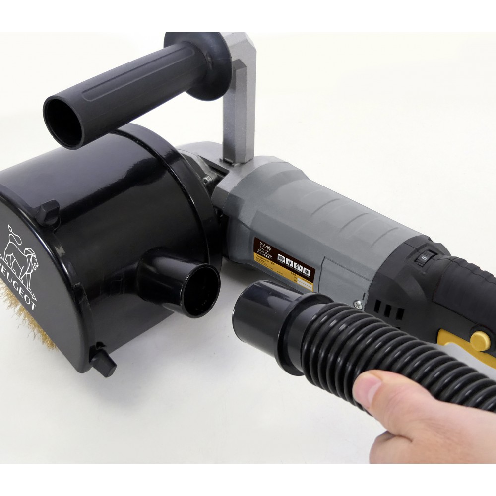 Peugeot a pensé ce rénovateur pour une utilisation intensive et une maintenance facilitée. Un collecteur de poussières intégré permet de limiter les projections et de maintenir une zone de travail propre, particulièrement lors du décapage du bois. Le câble d'alimentation de 3 mètres offre un rayon d'action confortable sans nécessiter systématiquement une rallonge. L'entretien est optimisé par un accès rapide et externe aux charbons du moteur, permettant leur remplacement sans démonter entièrement la machine ; une paire de charbons de rechange est d'ailleurs incluse dans le pack.