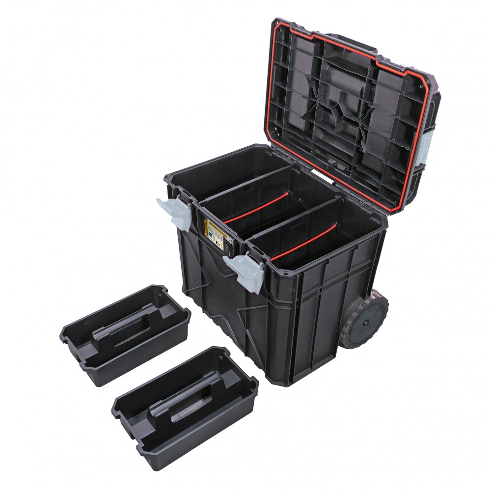 La base de ce système repose sur la caisse StorageHub-6550 (réf 250720), un véritable trolley de chantier capable de supporter jusqu'à 50 kg. Elle est équipée d'une poignée télescopique articulée et de deux roues antidérapantes pour une mobilité sans effort. Son aménagement intérieur est exhaustif avec :