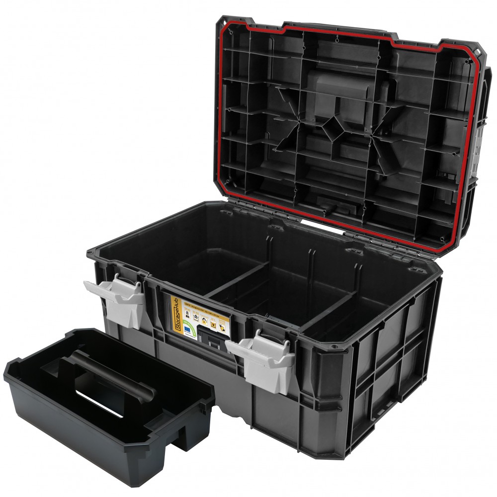 Le sommet de votre tour de rangement est occupé par la StorageHub-1220 (réf 250716), l'unité dédiée à la quincaillerie fine et aux accessoires. Conçue pour une charge de 20 kg, elle contient 8 boîtes de rangement amovibles (dont une avec couvercle) et des séparateurs modulables pour un tri personnalisé de vos vis et clous. Son couvercle en polycarbonate transparent haute résistance permet de vérifier l'inventaire d'un seul coup d'œil sans ouvrir la mallette. Grâce au système d'attaches latérales, cette caisse se verrouille instantanément sur le module inférieur, assurant une cohésion parfaite de l'ensemble lors des déplacements sur terrain accidenté.